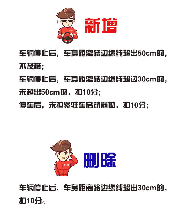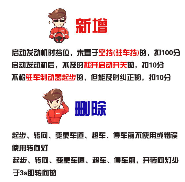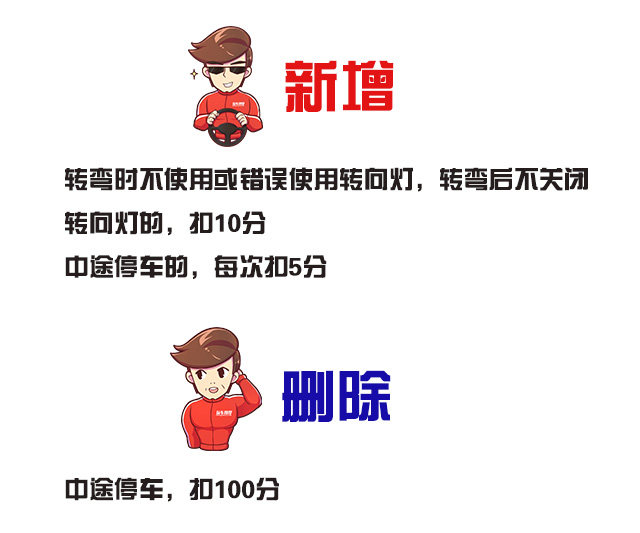 原有的车轮轧道路边缘线直接不及格继续执行,新增了不使用转向灯或者错误(方向弄错了,例如左转打了右灯)使用转向灯,均需要扣10分,转弯后不及时关闭转向灯,扣10分,增加了一定的难度,另外还是删除了中途停车直接不及格这个规定,停一次5分,给了你一点点机会,可是绝对不要浪哦。