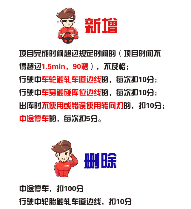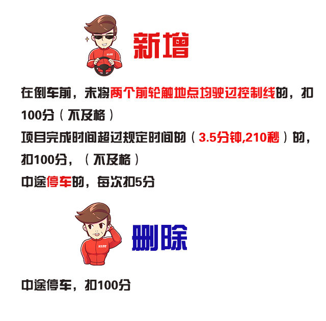 原有的不按规定线路、顺序行驶,碰擦桩杆、车身出线、倒库和移库不入等不及格规则继续保留,而新规中删除了原有停车立马GAME OVER的玩法,提高了容错率。每次停车(停车时间超过2秒)扣5分。除此之外,为防止别人偷跑和提前取好位置倒车,添加了前轮必须过控制线的规定,最让人注目的是,超过210秒即不及格,屏蔽了许多磨磨蹭蹭考试的人,如果你说不熟悉问教授怎么办?教授会告诉你:多练啊!