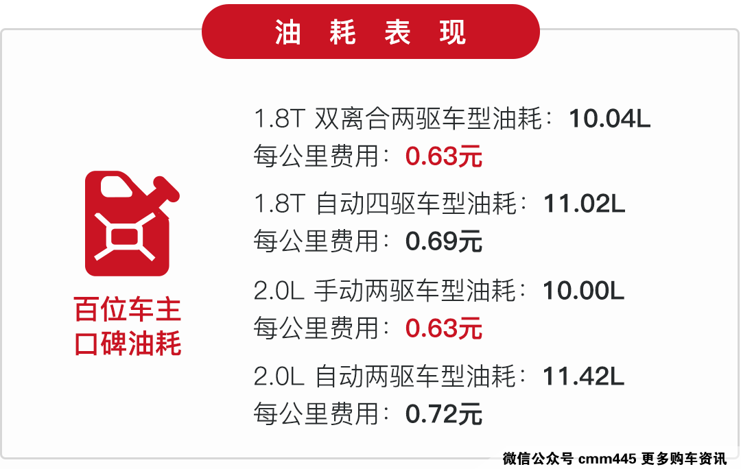 另一个问题就是1.8T 5AT车型全系配有适时四驱系统,而7挡双离合车型则全系为两驱。2.0L车型的整备质量与1.8T双离合车型一致,但自动挡车型的油耗比1.8T的四驱车型还高出一截,明显是发动机热效率不如1.8T。