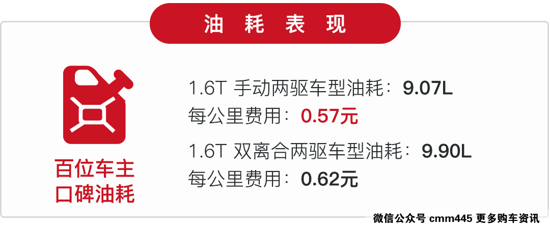 发动机采用多点电喷技术,在控制燃油喷射量方面的精准度要弱于缸内直喷一些。自动挡车型采用的是6挡双离合变速箱,没有液力变矩器的消耗,使得自动挡车型的综合油耗可以成功地压制在10L/100km以内。