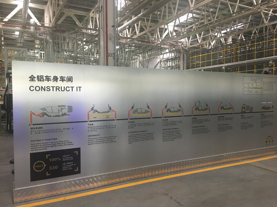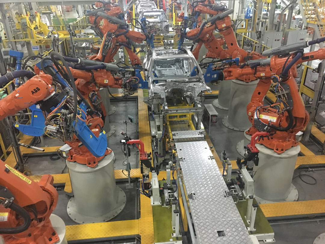 全铝车身车间采用机器人全自动化生产,同时采用柔性生产的方式,不同车型共线生产可以增加制造的效率和减少资源浪费。