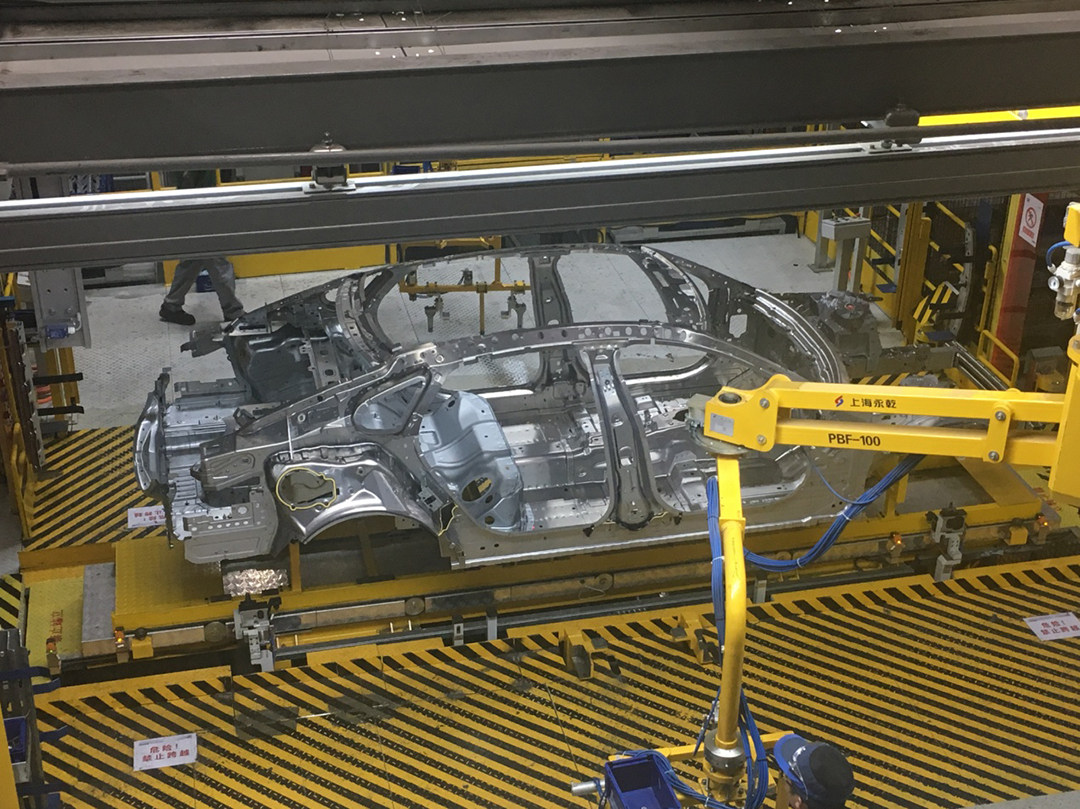 铝车身车间采用的自冲铆接工艺。由于不需要使用焊接工艺,因此车身连接处不会产生热变形,无飞溅产生;仅需气源,无需循环水冷却,整个过程无任何污染物产生。铆接技术拥有更高的抗疲劳强度和静态紧固力,能够大幅增加车身强度,降低变形程度,在车辆遭受外来撞击时,使用铆接技术连接的车身能承受更长时间和更剧烈的碰撞。这也是制造全铝制车身最关键的技术之一。