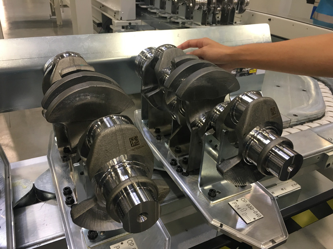 曲轴毛坯料在这里上线,并安装到特制的托盘上,之后,曲轴会继续向前,通过“机械防错”工位,以防止曲轴放置错误。接着进行激光打标,在每一个曲轴毛坯料上打印二维码,并在MES系统中生成数据,这样可以在系统中实时追踪曲轴的生产状态和进度。