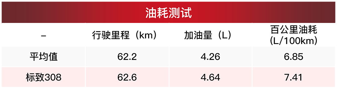 标致308的加速很一般,但是油耗却不低。测试了62公里,其中高速路段为26公里,总共消耗燃油4.65升。