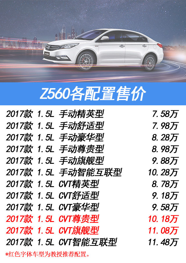 总结:Z560是为数不多的十万就能落地的中型车,价格确实便宜,不过存在配置太低问题,所以教授比较推荐尊贵型和旗舰型两款配置。这两款配置的配置高,而且即使横向对比别的中型车,它的价格也算十分低廉,值得购买。