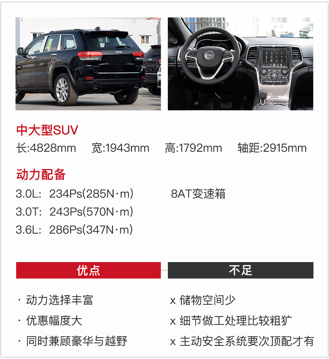 很多人把越野车叫做吉普车,说到吉普车就不得不说Jeep这个品牌,忠于越野,即便是自由侠也拥有不俗的四驱性能表现,大切诺基就更加不用说了,2017款取消了以前的5.7L自然吸气V8发动机顶配车型,虽然现在全系均为V6发动机,但气势还是在的。