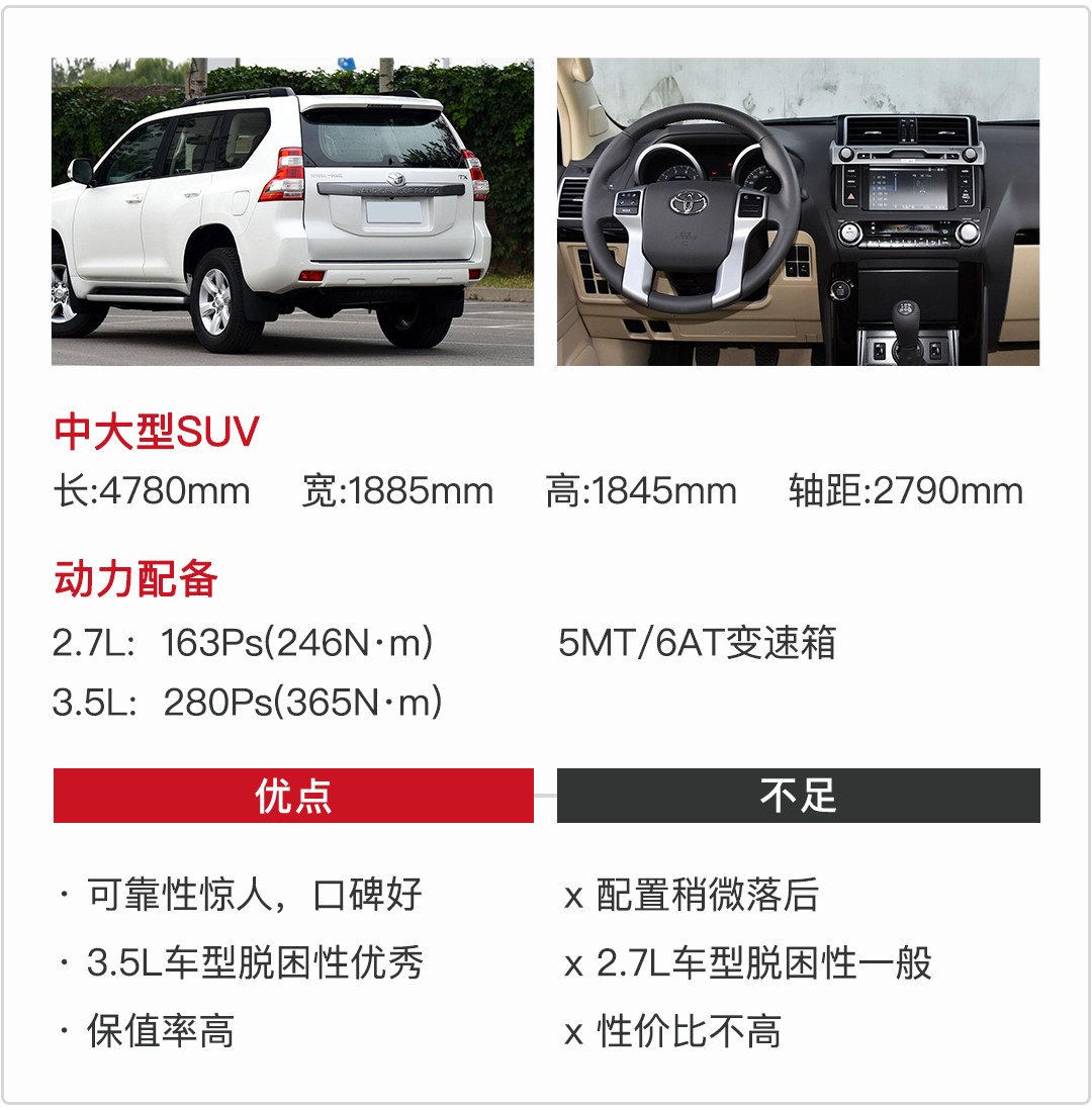 三辆车各有所长,能够满足不同人群需求,MKX拥有美式的高贵豪华,气场十足;普拉多底子很好,非承载式车身,改装潜力巨大,成熟可靠;大切诺基拥有非常智能的四驱管理系统,大排量V6发动机,气势飞扬,这些才叫SUV嘛。