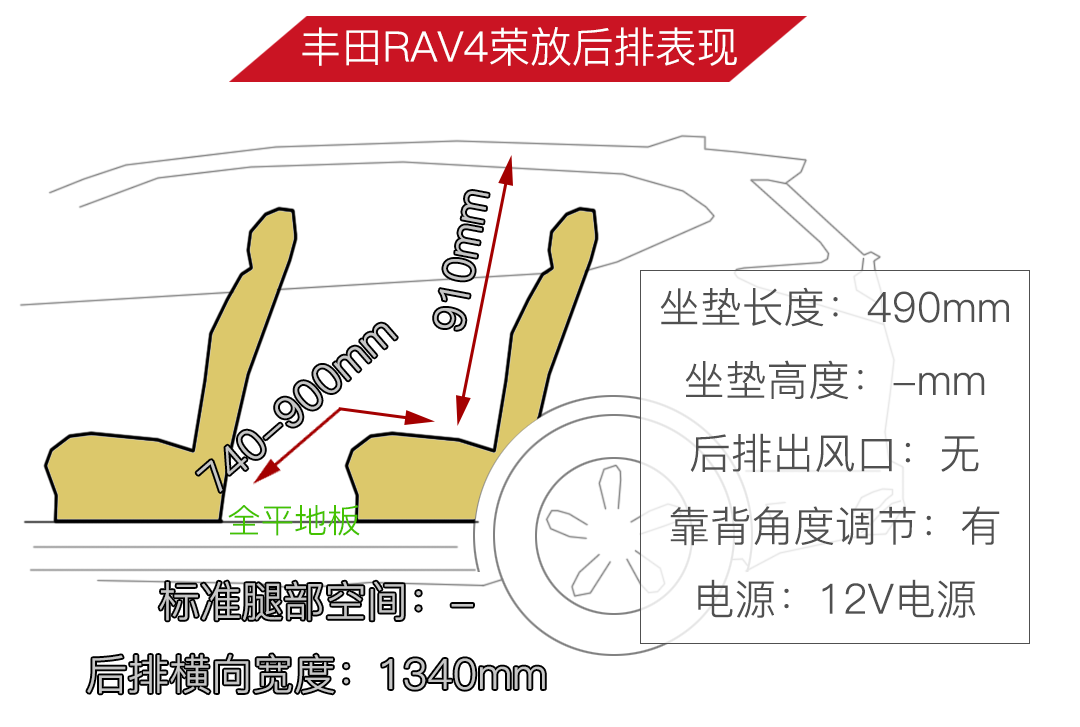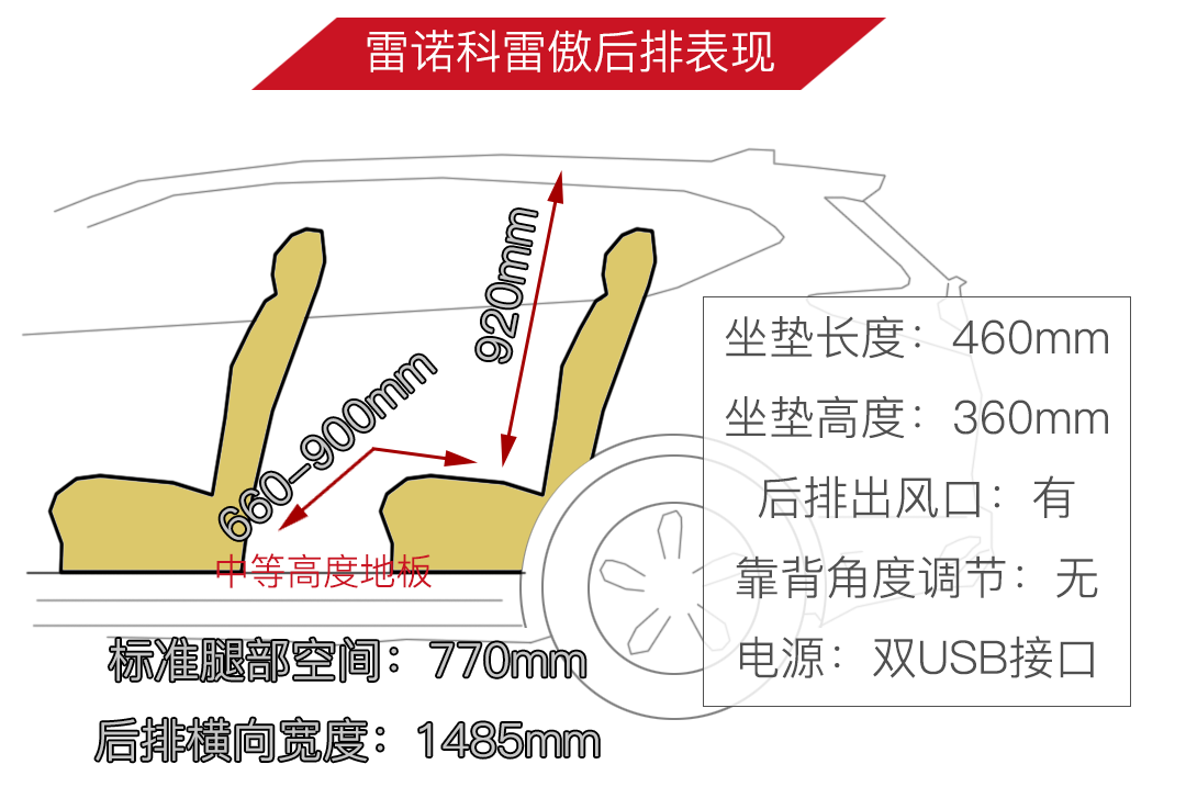 科雷傲在车内空间表现上其实比RAV4要强,而且还有双USB接口、后排空调出风口;但是科雷傲的后排座椅却不支持靠背角度调节,460mm的坐垫长度也比RAV4短了一截,对大腿的支撑并不太好,再加上高高的地板凸起;综合来看科雷傲距离RAV4还是有些距离,不过就实际乘坐来看,科雷傲的后排舒适度还是非常高的。