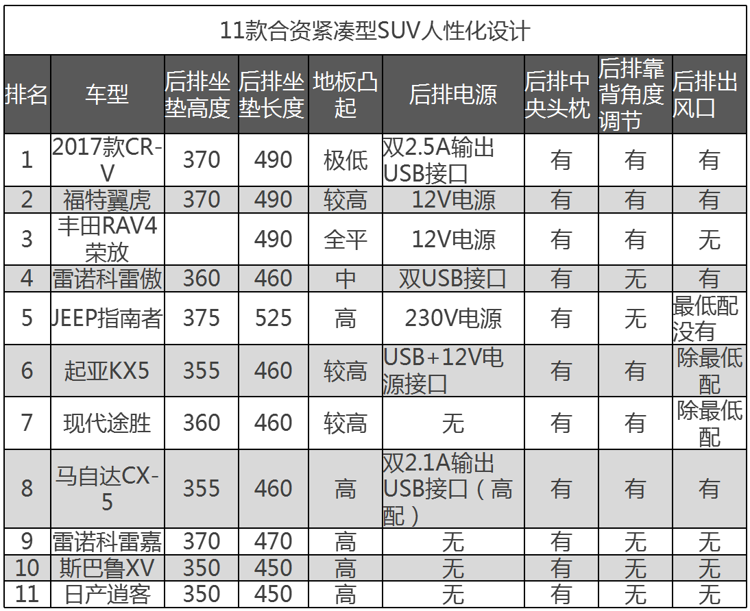 从第六开始的车型硬伤就有一些了,比如途胜和KX5的座椅尺寸偏小,CX-5的腿部空间表现紧凑、科雷嘉、斯巴鲁XV和逍客在人性化配置方面很寒酸,后排待遇很低,由此可见合资紧凑型SUV的后排表现在空间和人性化方面还真有不小差异的,而后排对于家用来说尤其重要,所以买车的时候一定要看准了买哦!