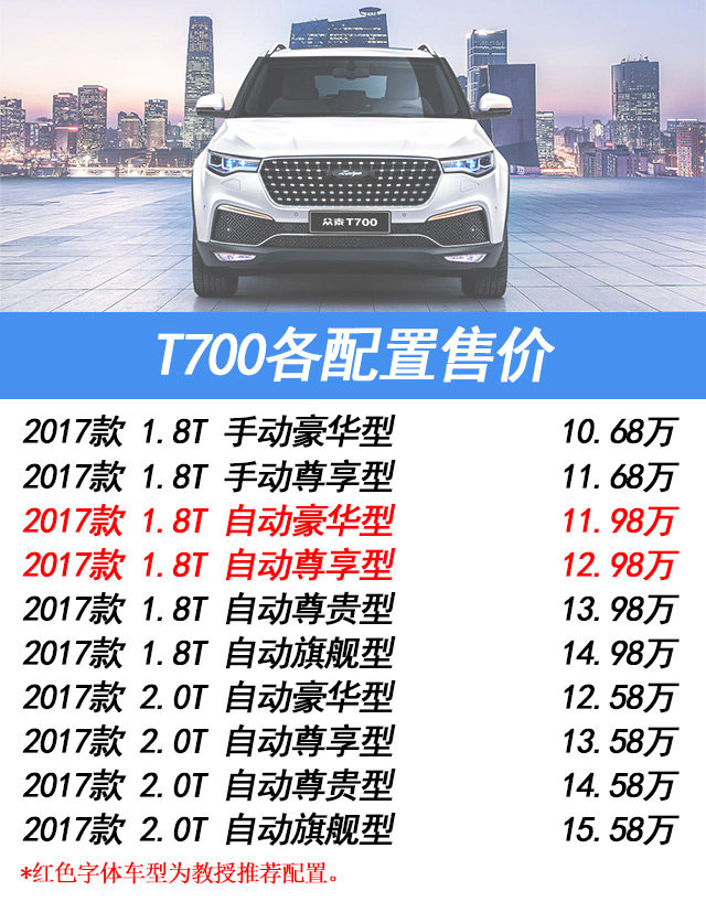 总结:从众泰T700的配置可以看出众泰对这款原创车型的重视。众泰T700的基础配置十分丰富,所以预算吃紧的用户就算买T700豪华版(最低配)也能获得非常好的享受。如果预算有那么一些富余,教授会更加推荐购买1.8T自动尊享版,因为配置提升非常明显,而且只贵1万,性价比十分之高。旗舰版的T700配置高到让教授吃惊,当然价格也是比较贵的。如果你的预算刚好那么多而对配置要求十分之高,那么众泰T700的旗舰版是你的不二之选。最后,祝各位买到心仪的汽车。