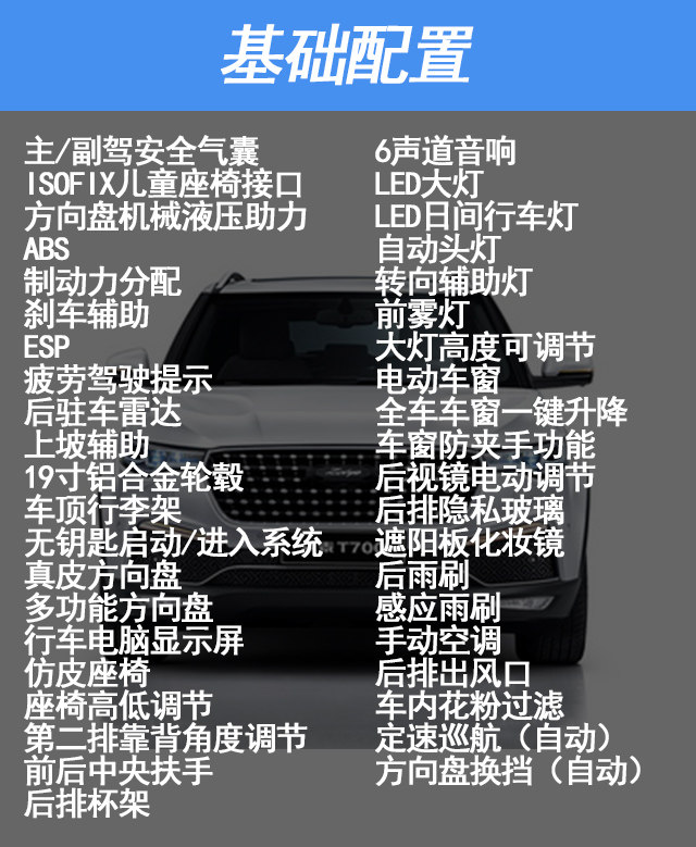 自动豪华版的配置就是基础配置,就像教授在上文所说,T700的基础配置非常丰富。安全配置已经没什么可挑剔的地方,ESP和刹车辅助都标配了。灯光配置也不含糊,全系标配LED大灯,LED日间行车灯,转向辅助灯,自动头灯和前雾灯。这种配置在其他车型可是顶配才享有的配置。所以这个配置十分适合那些购车预算吃紧,但是又想买配置高的车主。