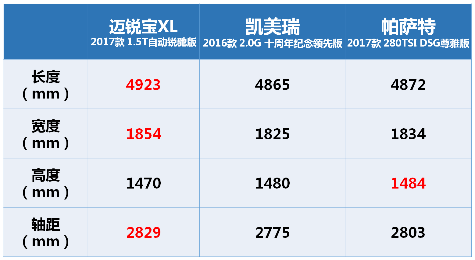 再看实际尺寸,可以说迈锐宝XL全面占优,车身长宽度都优于对手,而2829mm的大轴距则为迈锐宝XL提供了更喜人的乘坐空间。