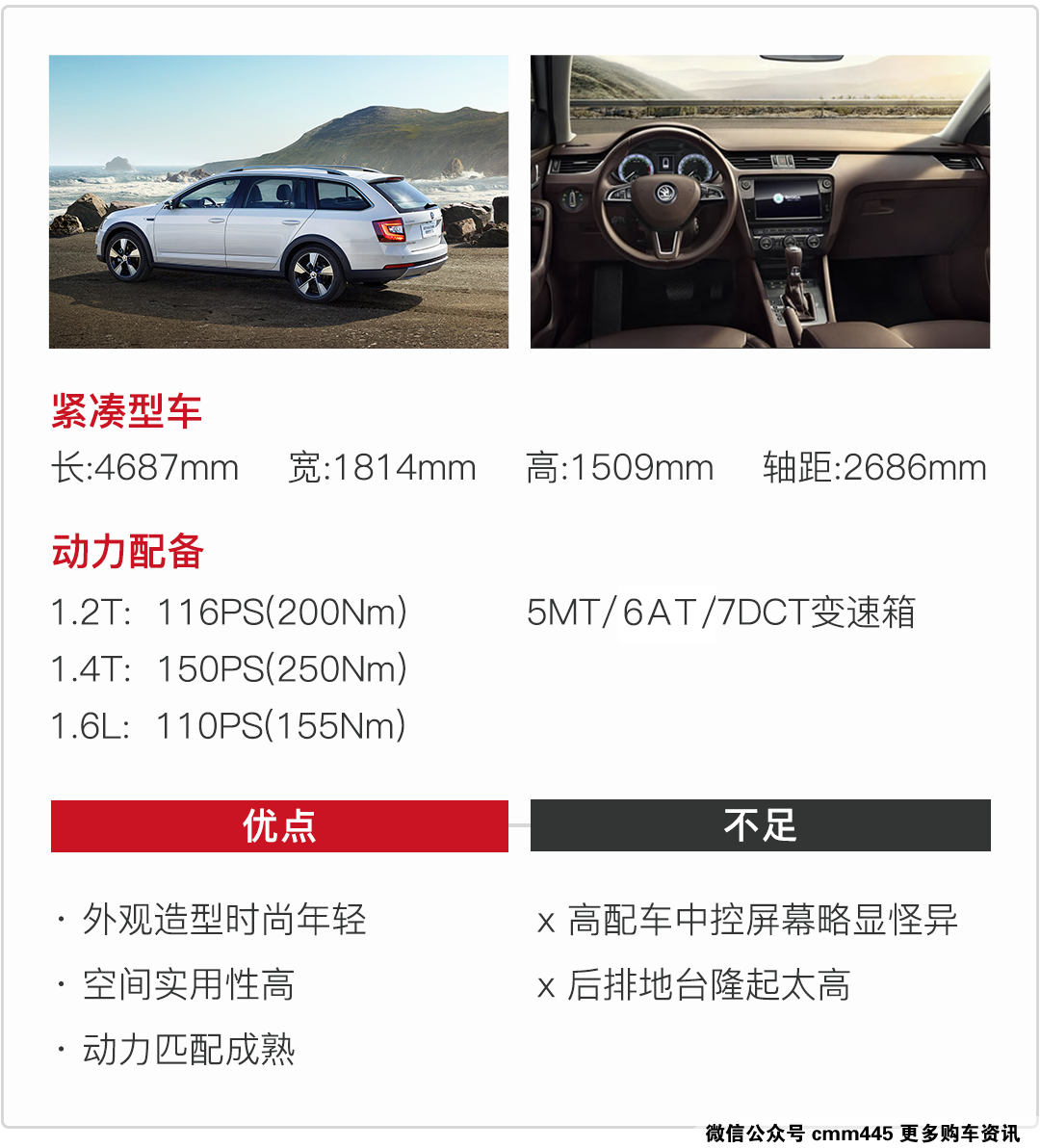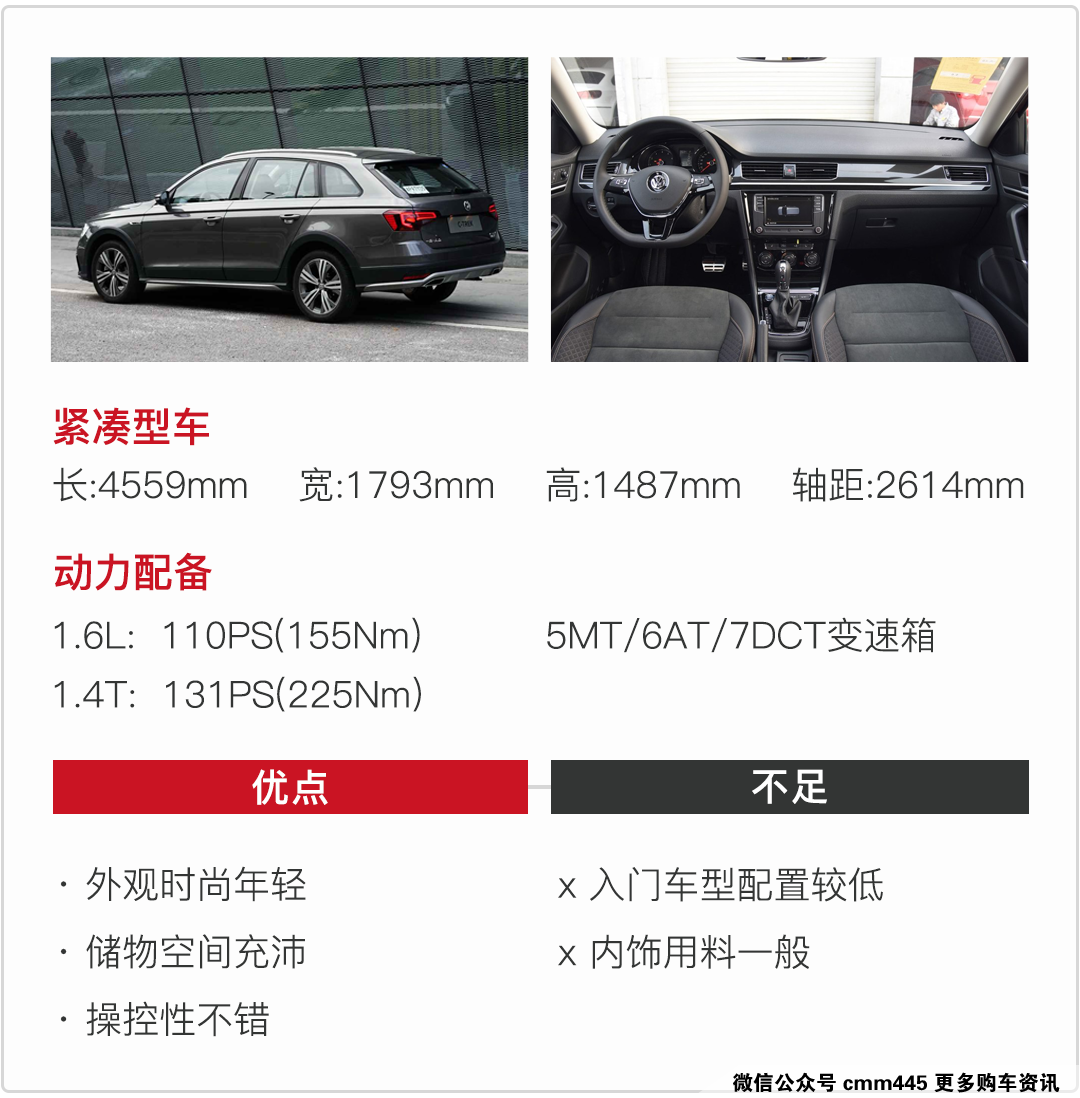 而在后备厢空间方面,它的常规容积为589L,把后排座椅放倒后容积能拓展至1507L,在空间表现上不如明锐旅行车,而且放倒座椅后也有一定的隆起。在动力方面,高规格车型也采用1.4T配合7挡双离合变速箱的动力总成,官方破百时间仅需9.3秒。