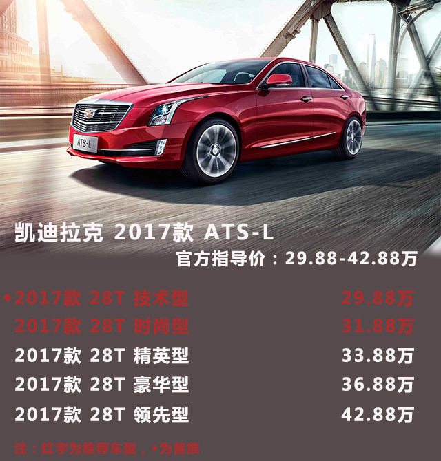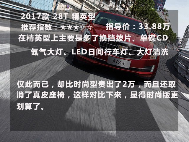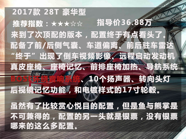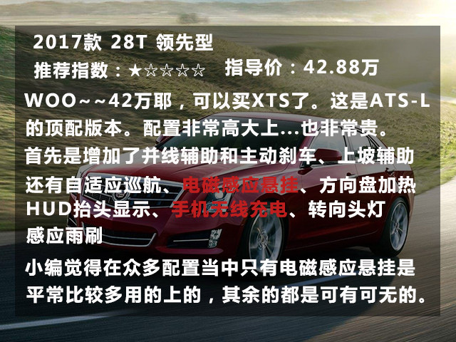 好了,凯迪拉克ATS-L大概就是这样,首选当然是“丐中丐”的技术型,它除了没有液晶屏幕外其他都是挺厚道的,给孩子、送爸妈是一份不错的礼物,比送脑白金更实用。不嫌LOW的客官可以在汽配城装上个汽配城风格的中控屏,同样好吃又不贵。当然加2万入手个时尚型还可以得到不错原厂8寸液晶显示屏+CUE系统、后雷达、后视镜电动折叠等等一系列的实用配置。再不满意的话还有豪华版可以选择,它配有BOSE环绕音响系统带10个扬声器,让你堵在苦闷的路上是可以缓解焦躁的心情。当然还有一堆高科技实用配置,具体请看上图。但是先决条件是兜里要有足够多的软妹币。