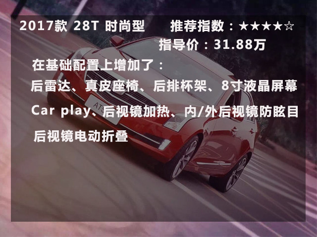 如果觉得“乞丐版”这个名字太LOW的话,时尚型也是一个不错的选择,多加2万大元即可得到全新一代的CUE系统,虽然没有倒车影像,但是在外面加装也不贵。还有一个缺点就是“蜡烛灯”不过加装最贵的也就是2000块左右,所以是无伤大雅的。