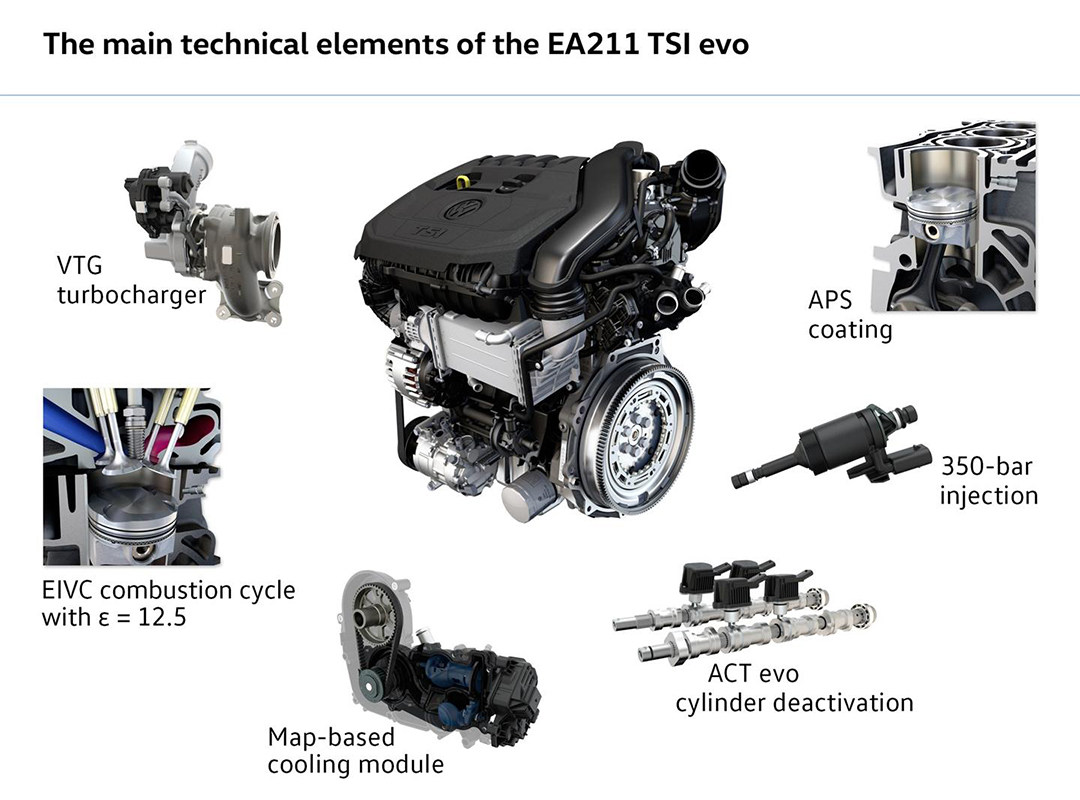 作为大众首款装配了 可变截面涡轮增压器 的量产汽油发动机,这款1.5T发动机的亮点非常多,其中包括喷射压力高达350Bar的燃油喷射器,电控冷却模块,汽缸壁采用大气等离子喷涂技术,排气歧管热力学优化等等。虽然在排量上多了“0.1L”,但据说油耗能够比原来的1.4T发动机降低约1L/100km。