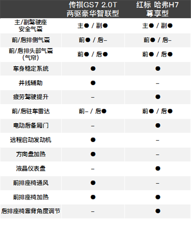 从表格中不难看出,两款车再安全配置方面是做得相当厚道,舒适性配置也不错。可是哈弗H7要多出了类似电动后备厢门、第二排座椅靠背角度调节等实用性的配置。而传祺GS7则配备多出了互联系统、手机无线充电、远程启动发动机等科技配置,两款车彼此各有千秋。
