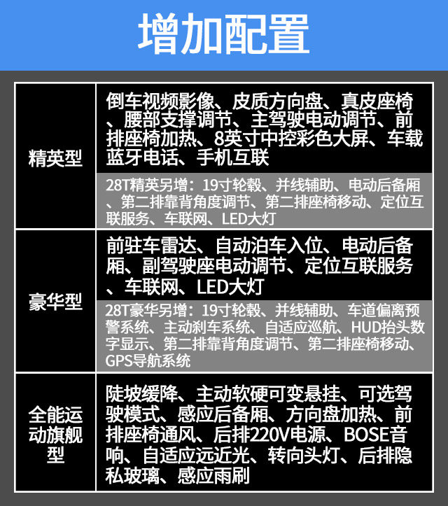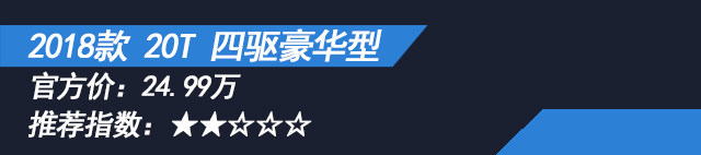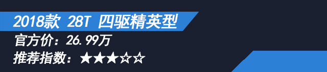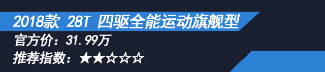 28T四驱豪华型比28T四驱精英型贵上两万,不过我认为,2.0T里,豪华型是比较折衷的解决方案。28T豪华型比起28T精英型,升级主要在安全配置方面,车道偏离预警、主动刹车这几个配置目前比较主流,实际使用体验也可以。另外HUD的加入,让整车的科技感上更上一层楼。