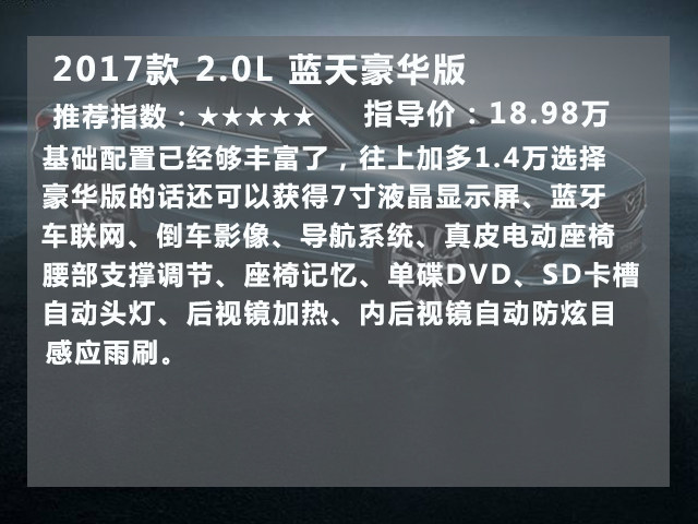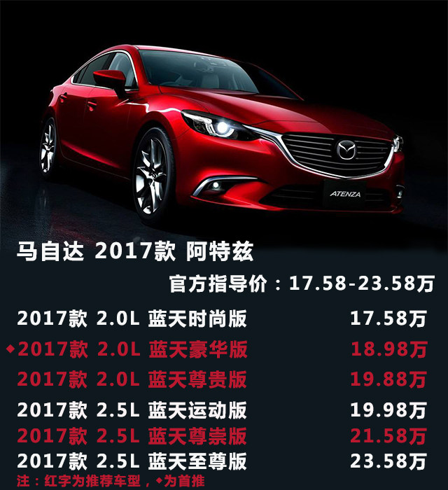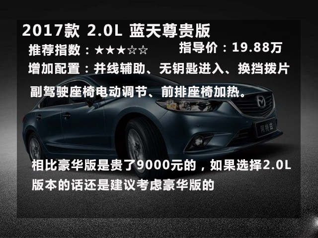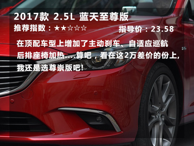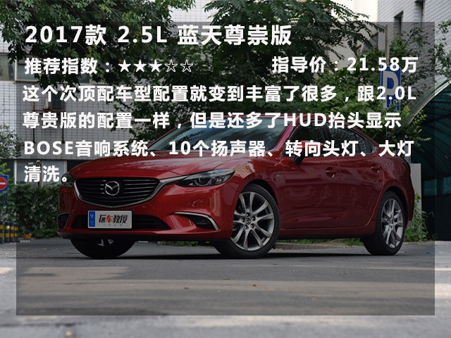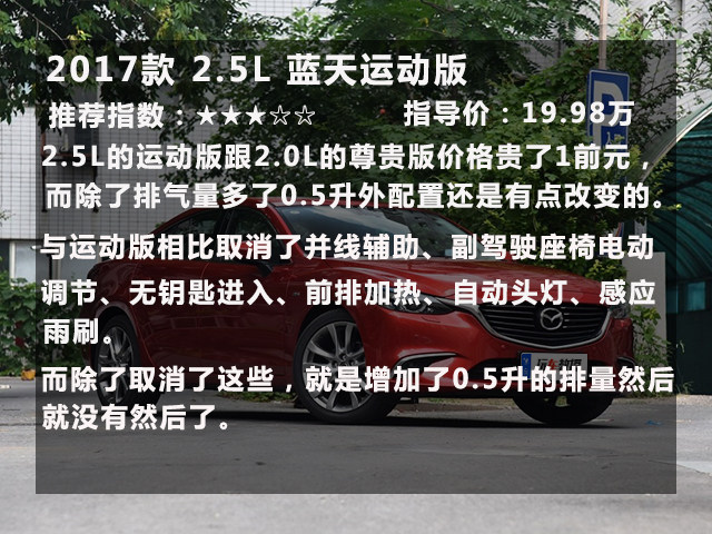 综上所述:马自达6 阿特兹的入门版已经相当不错,17.58万的起步价还附送一大推的实用配置 ,实在难得。看到这里,再回头看看日系3强“日两田”定价高、配置吝啬。是不是突然觉得马6很划算?如果是作为家用车,日常代步、周末带孩子去游山玩水的话2.0L的版本就足够了。它能拥有不错的燃油经济性和中庸平凡的动力。2.0L蓝天豪华版是一个不错的选择。而如果选择2.5L的朋友要提前做好心理准备的地方,就是2.5L发动机更多是给你从容感,而不是给你刺激感,日常节奏驾驶,加速感和2.0L版本基本一致。因为这台发动机要到高转才渐入佳境,而在市区中难以试探到它的真面目,只有在超车、高速区间提速等大负荷环境下,才体现出0.5L的价值。当然2.5L并不是不好,毕竟排量就摆在这里了,它的蓝天尊崇版也是个不错的选择。