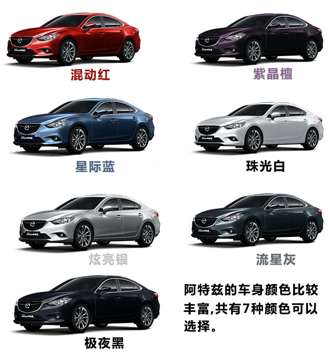 马自达6 阿特兹总共有以下这么多种颜色可以选择,最骚艳的当然是魂动设计理念配魂动红啦。
