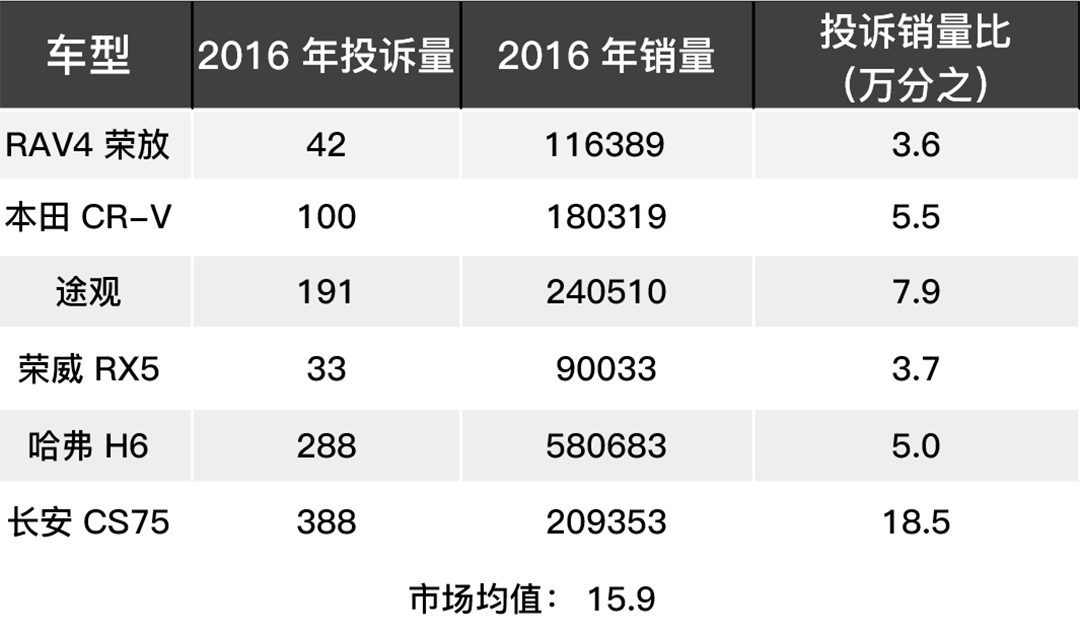 根据上表我们可以看出RAV4荣放以及荣威RX5的投诉率是较低的,但是它们都是2016年上市的新车,投诉以及销量数据参考意义不太大。但整体来说,本田CR-V、途观的销售量较大,而投诉量不超过200,