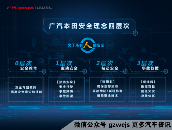 广汽本田于2007年正式发布了 “为了所有人的安全”企业安全理念,突出在交通社会中“人”的重要性,并将汽车安全的关注重心由驾驶员覆盖到乘员与行人。这一安全理念包含四个层次,即0层次的安全教育、1层次的预防安全(主动安全)、2层次的碰撞安全(被动安全)和3层次的事故救助。