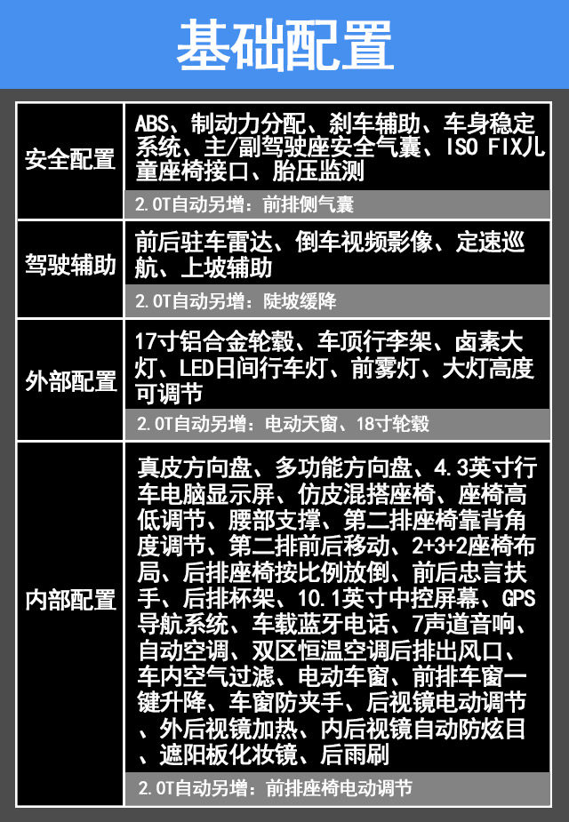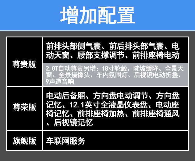 尊贵版确实新增了不少配置。在安全配置方面,能装上的气囊都装上了。前排座椅电动调节,腰部支撑的使用起来确实方便,尤其是遇到家里两个人以上开车的情况。另外2.0T自动尊贵版还会另外增加全景天窗、全景摄像头、9声道音响等配置。这一万块显然比较值。