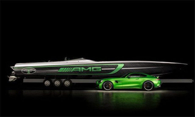 这台快艇以AMG GT R跑车为灵感,配色都基本上一样,快艇长度50英尺,配备了一个9L的V8发动机,不过不是AMG造的,是Mercury Racing造的专属发动机。