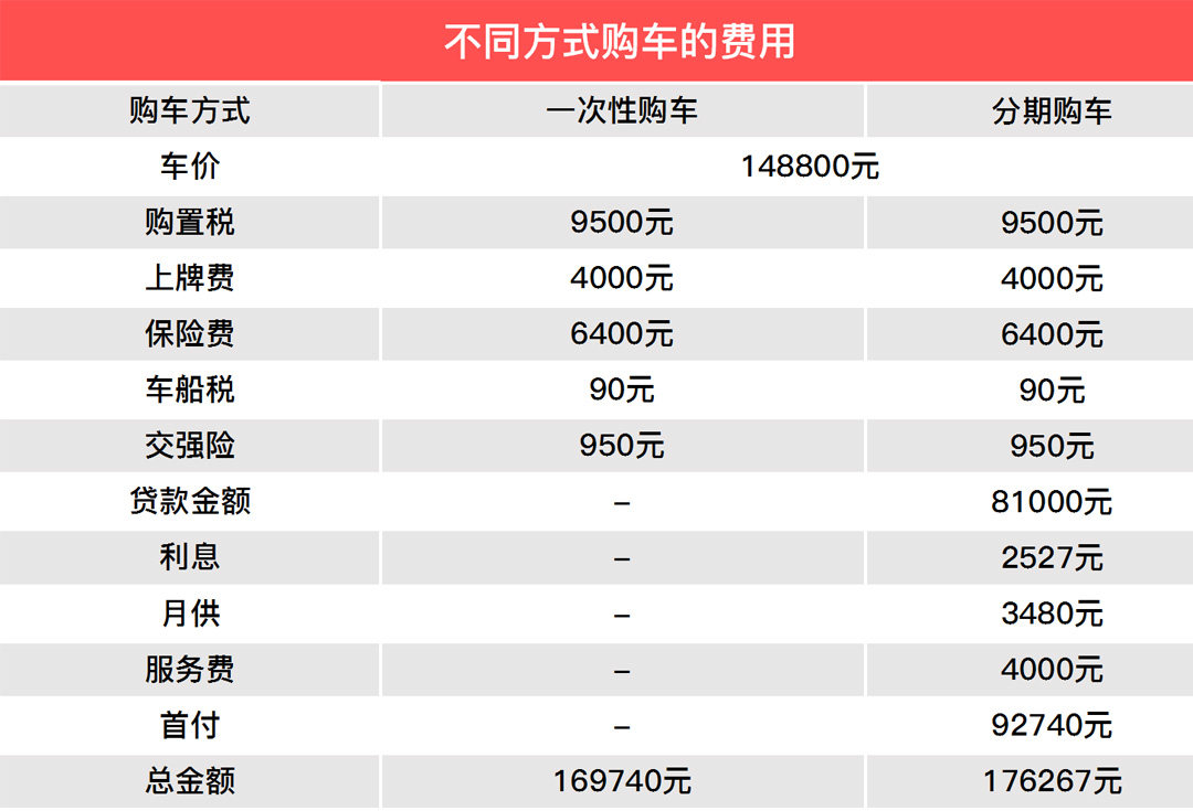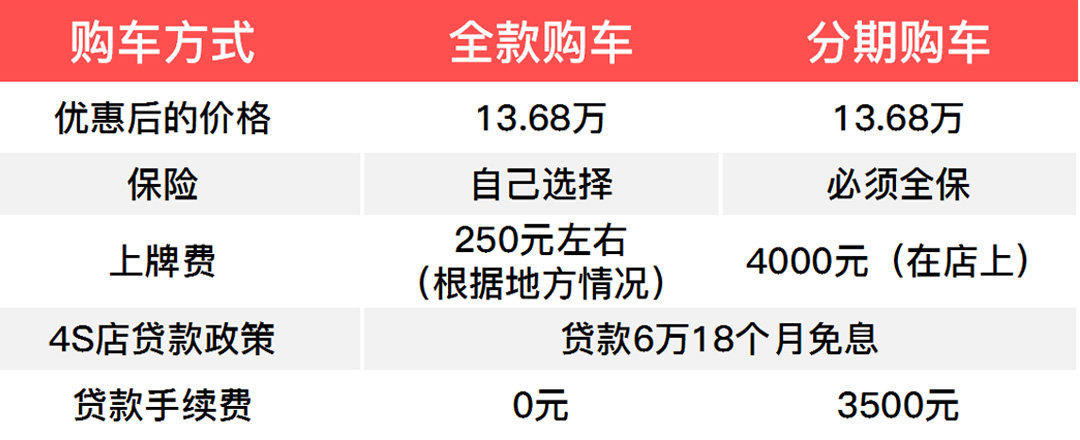 不管是全款购车还是分期购车,销售都是以优惠完3千购置税的价钱进行接下来的计算。我们先以保险费用一样的价格进行计算,如果选择全款购车情况,仅仅在上牌费和贷款手续费上都为自己优惠了接近7千多块,最后的全款购车价格159819元的基础上减去七千。