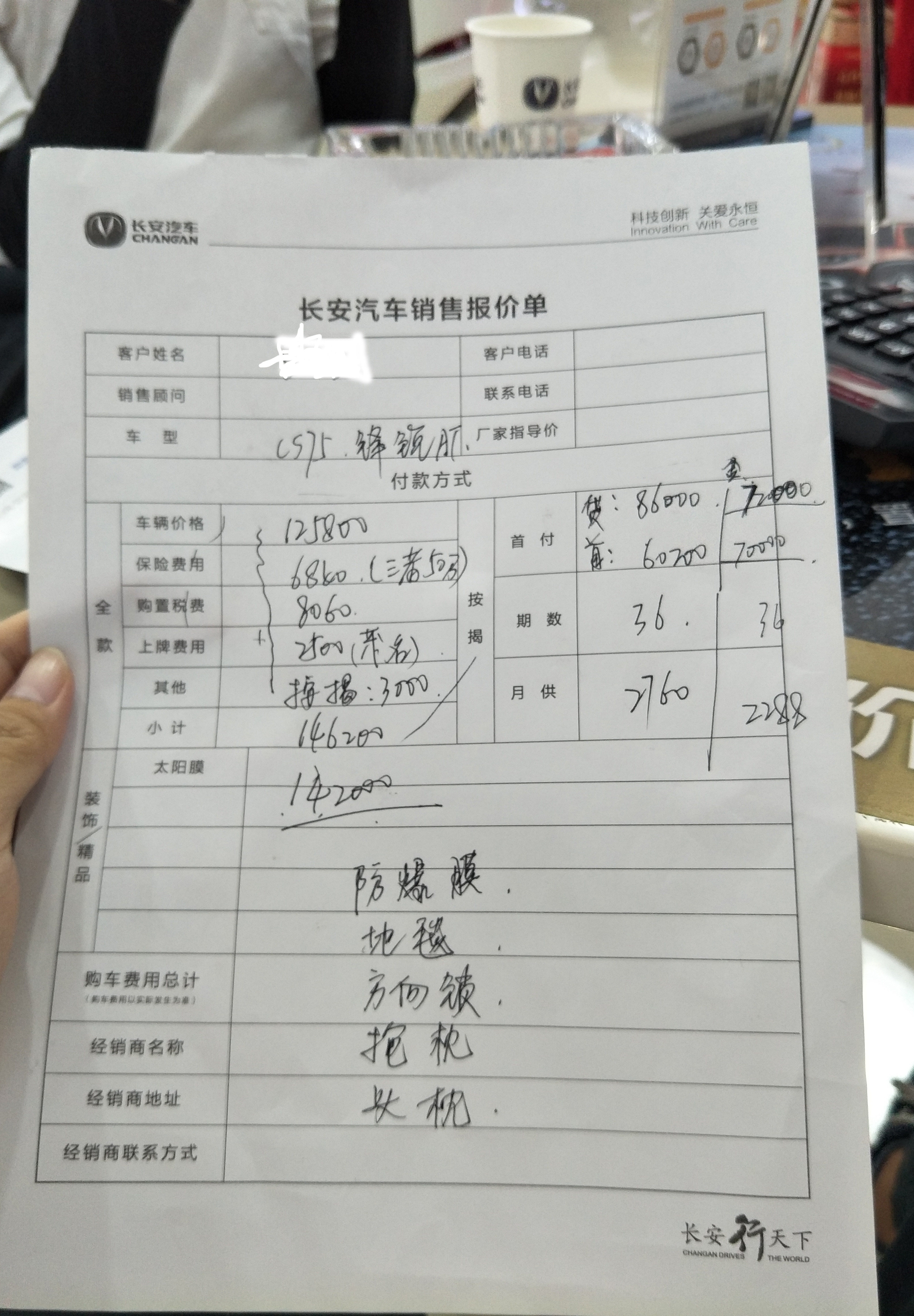 出乎意外的是,到店后销售所给出的优惠幅度与我们在网上不同的汽车网站上看到的优惠幅度有一定的相差,因为在来之前我们查询到长安CS75的现金优惠只有2千元,但是到店后所得到的是接近四千元。想必这肯定是国庆库存太多所导致的结果,否则不会出现高于网上参考的优惠幅度。