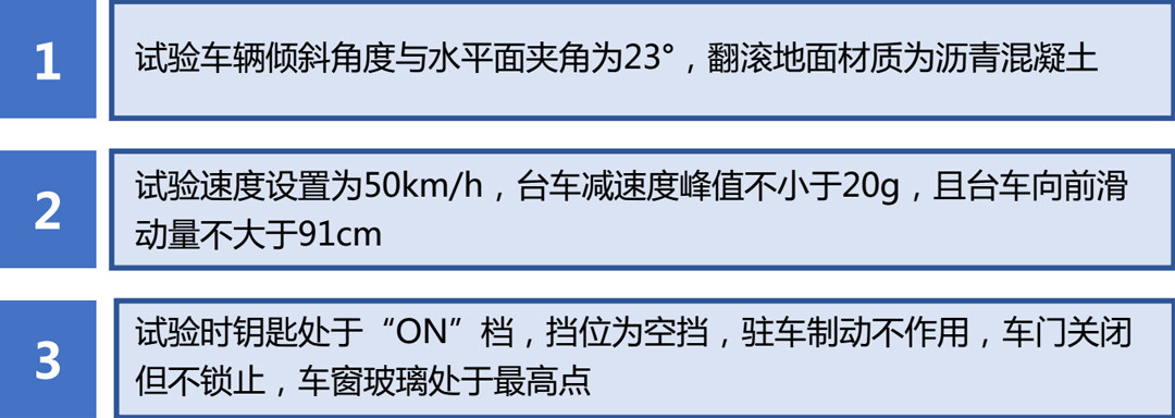 2、 翻滚初速度50km/h,高于国外48.3km/h的标准;