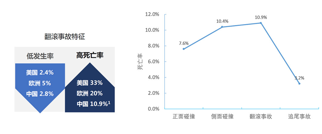 然而汽车翻滚事故实各类事故当中死亡率最高的,达到了10.9%,比侧面碰撞还要高,而且汽车翻滚事故的发生率非常低,在2.8%左右,所以对于翻滚事故的研究一直是汽车行业的难点。