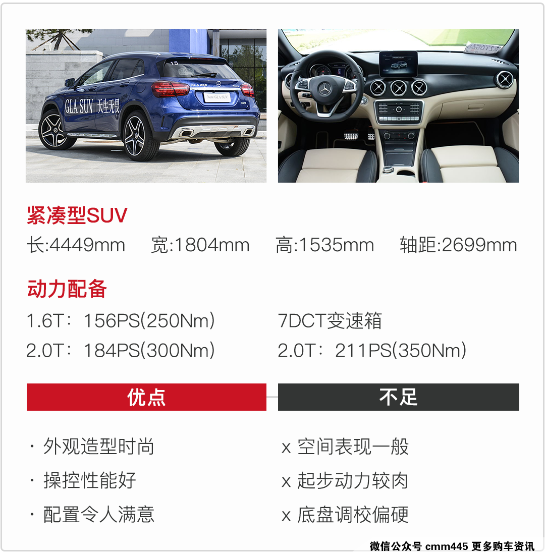 跟宝马X1比起来,更时尚、运动的奔驰GLA销量倒是差了一点。外观造型采用了溜背式设计,所以对车内的头部空间有一定影响,加上乘坐空间只能说够用,算不上十分宽敞,所以会选择它的大多都是比较追求个性的消费者。