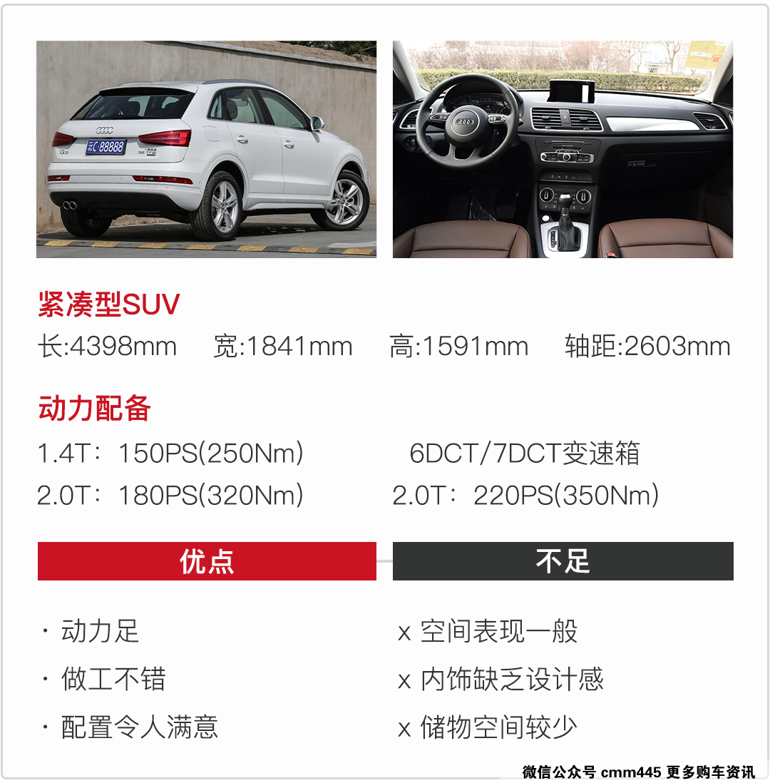 注意了!奥迪Q3不仅价格便宜,而且现在的购车优惠同样相当吸引人,根据不同车型,目前在广州这边能有3-7万左右的价格优惠,要比指导价便宜多了。
