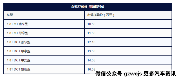 10月12日,众泰汽车旗下新生代商务领导者座驾——众泰Z700H正式上市,新车将推出豪华型、尊享型、尊贵型、旗舰型在内共6款配置车型,全系搭载1.8T发动机,匹配5速手动或6速双离合自动变速箱,售价区间为10.58-16.58万元,详情如下: