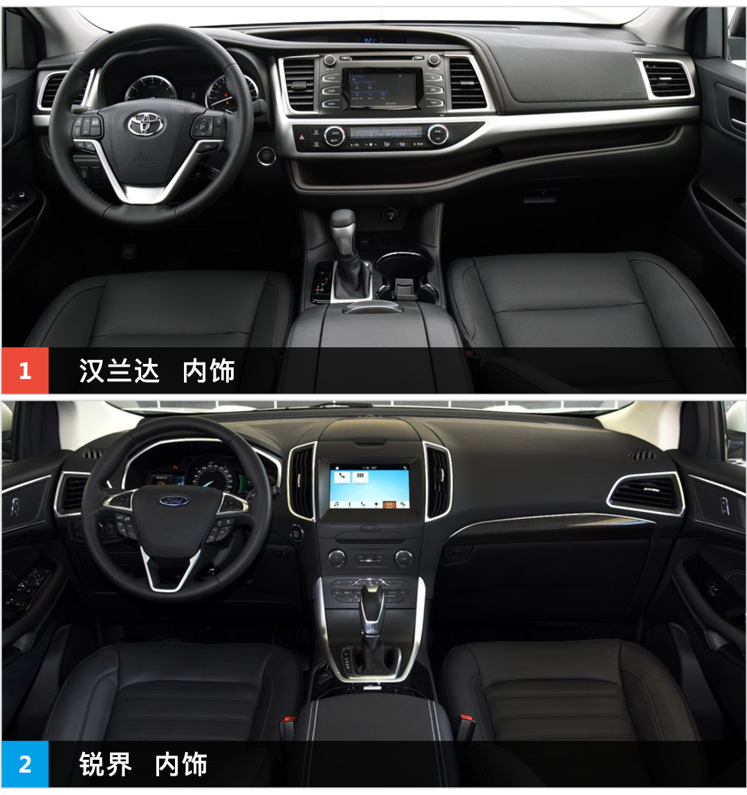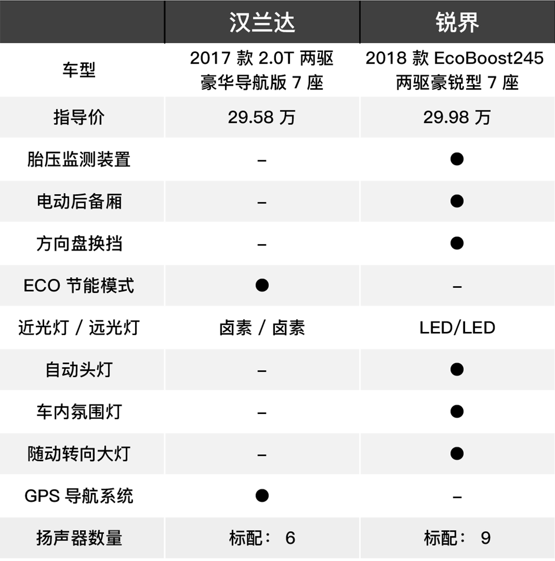 小雅选取汉兰达2017款2.0T两驱豪华导航版7座与锐界的2018款EcoBoost245两驱豪锐型7座做对比,发现官方指导价相近的它们在配置上存在一些差别: