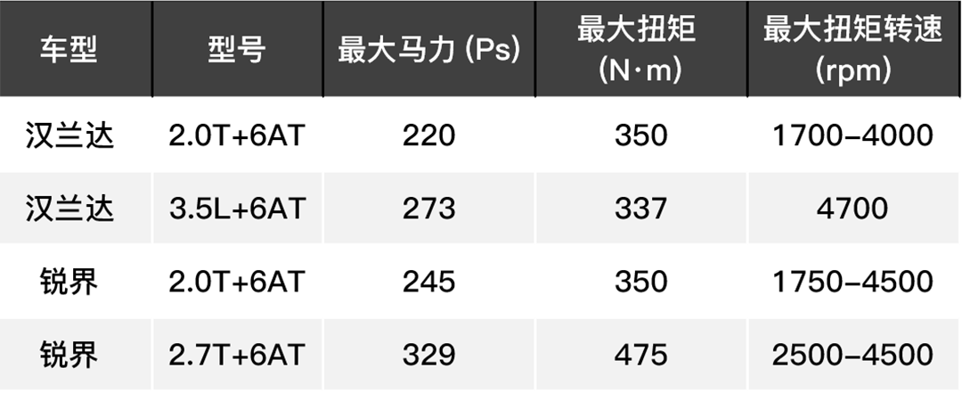 最后我们来看看两车在动力方面的表现如何:汉兰达搭载2.0T、3.5L两款发动机,匹配6挡手自一体变速箱;锐界搭载2.0T、2.7T发动机,同样匹配6挡手自一体变速箱。