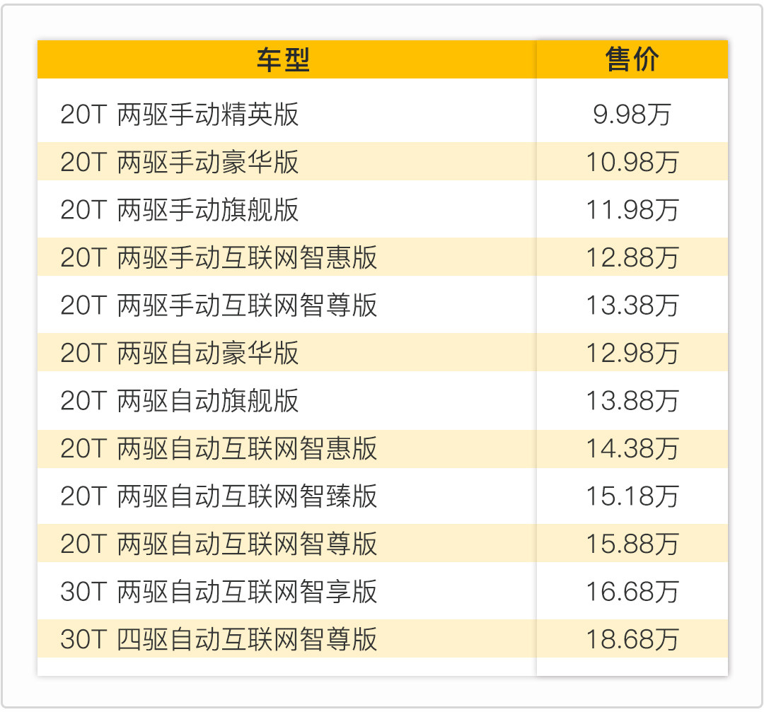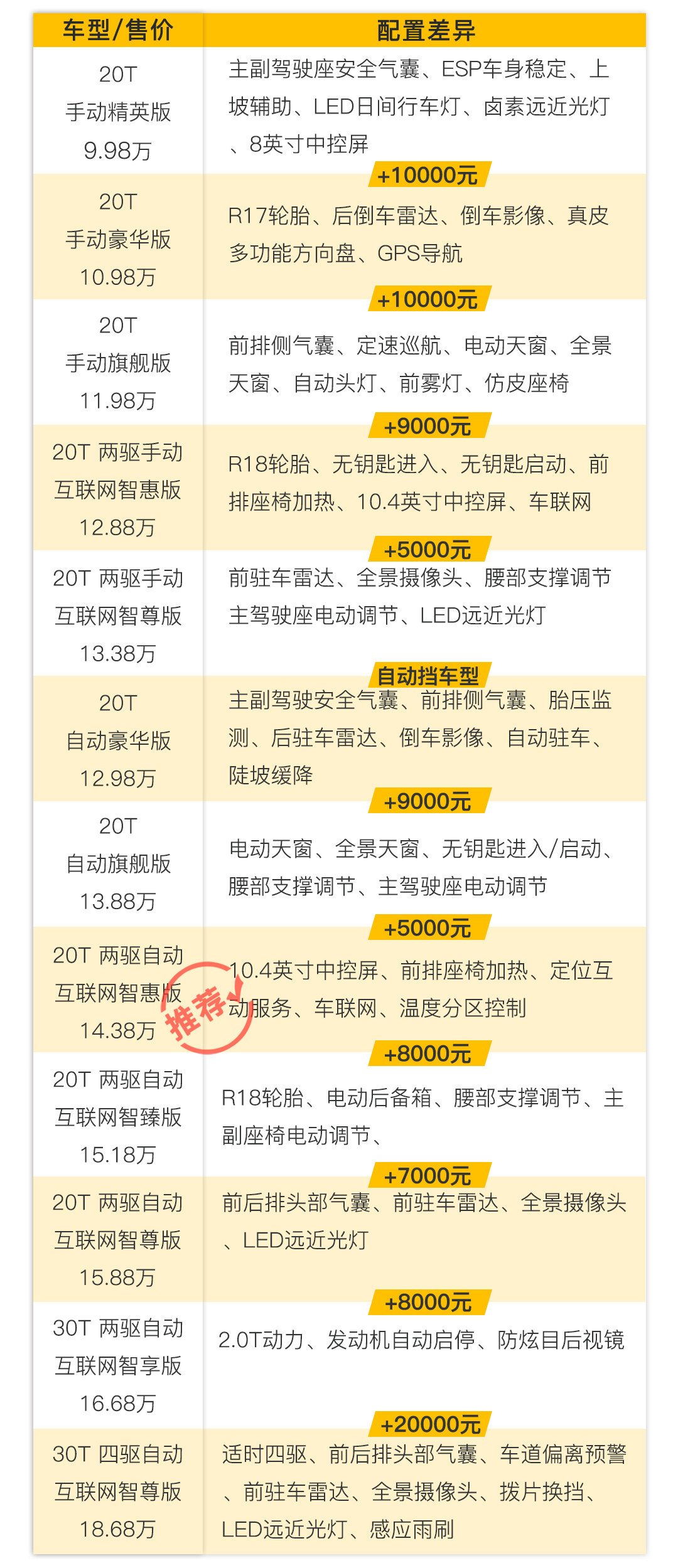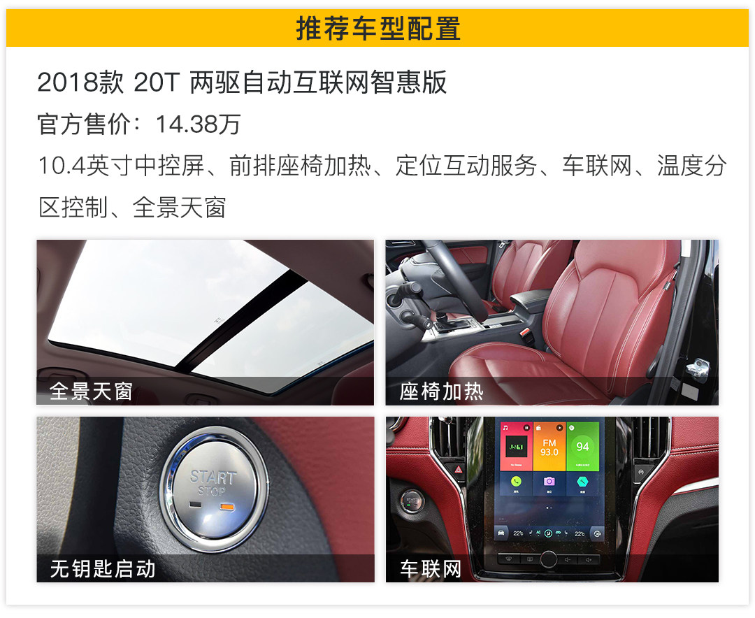 推荐理由:荣威RX5以车联网为卖点,推荐配置比较丰富的两驱自动互联网智惠版,带有升级的汽车智能系统2.0;舒适配置应有尽有,全景天窗、无钥匙进入/无钥匙启动,还有前排座椅加热,照顾到北方消费者的需求。