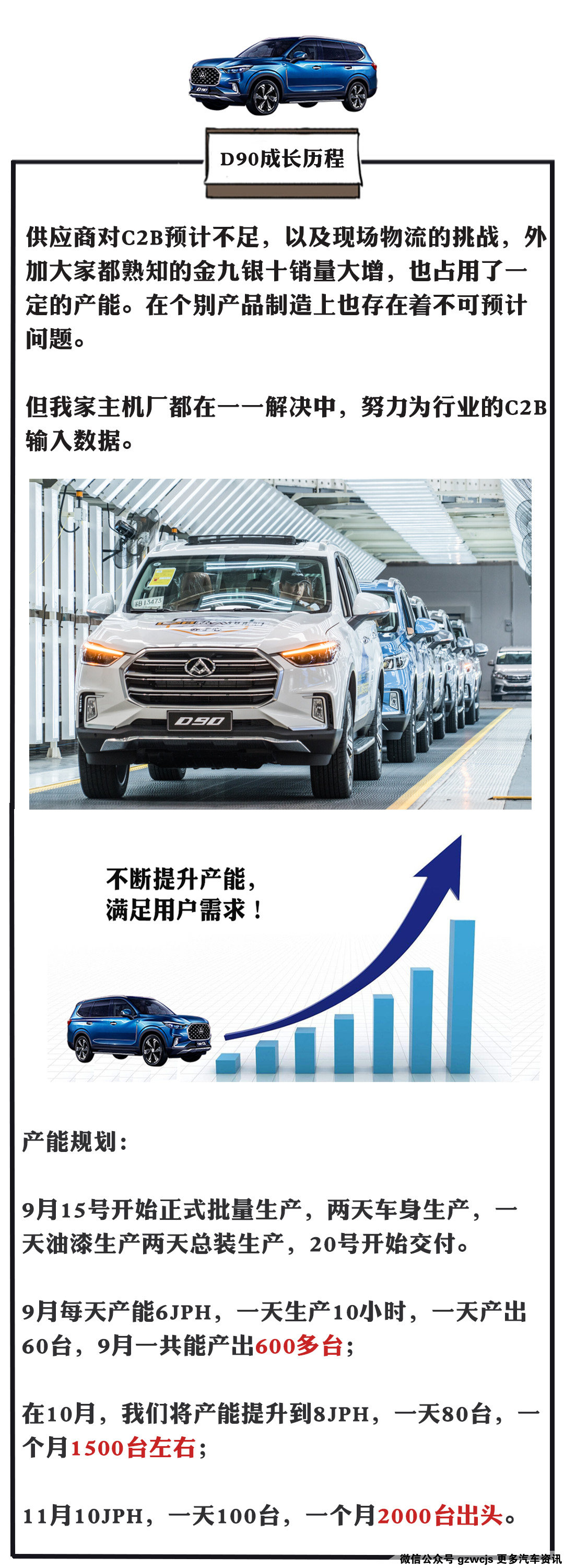 但我们有理由相信,这种C2B的“平民化”造车模式,在这个移动互联网的时代,这个用户需求多样化的社会……D90无疑符合了汽车界C2B新一轮需求,未来D90的销量将会和G10、V80刚刚进入市场的销售状态一样,将会有一个由小及大的爬坡过程!