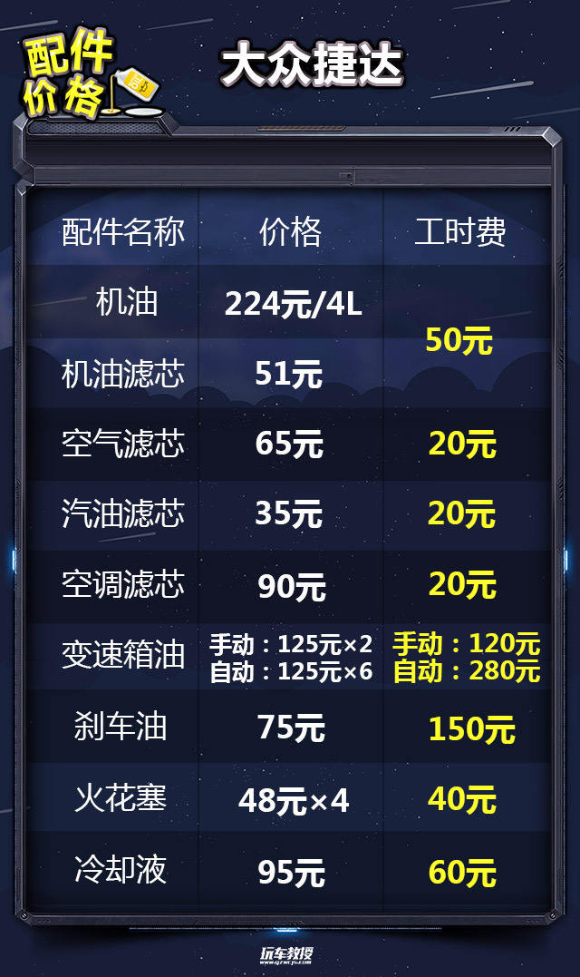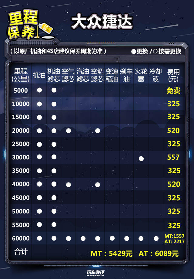 【注:捷达的厂家建议保养周期为10000公里/次,不过考虑到国内的用车环境,以及保养更换的是矿物油,教授还是建议大家以5000公里为周期来保养,这样也省心一些。这次的常规保养费用也是基于5000公里/次计算的,费用要比10000公里/次算出来的结果贵了1000-2000元】