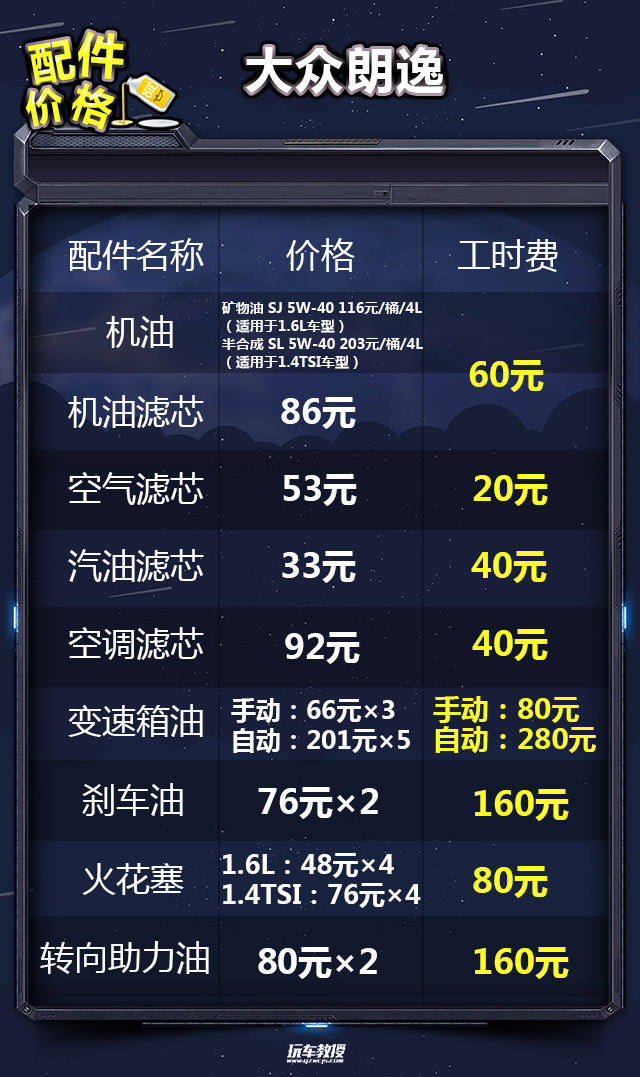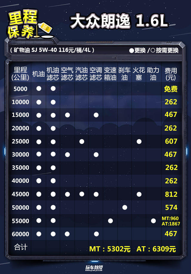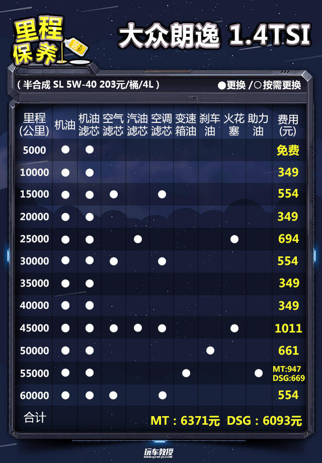 【注:朗逸的厂家建议保养周期为10000公里/次,不过考虑到国内的用车环境,教授还是建议大家以5000公里/次为周期来保养,这样也省心一些。此次的保养费用是基于5000公里/次计算的,费用要比10000公里/次算出来的贵】