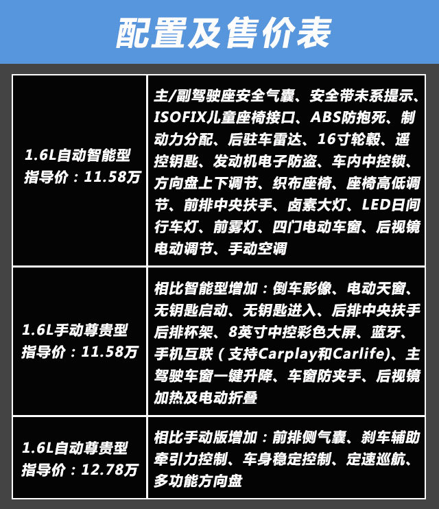 手动尊贵型和自动智能型价格一致,配置增幅不错,尤其是中控可映射的大屏和倒车影像,十分有用,但是变速箱换成了6速手动变速箱,对于大多数人来说,手动车型还是不太好友好的,左脚也累的慌,并且手动尊贵型没有车身稳定系统,也不能选装。所以这个车型就不推荐购买了。