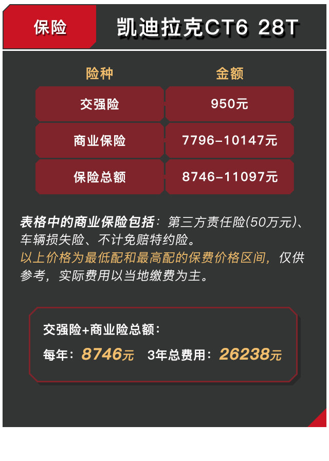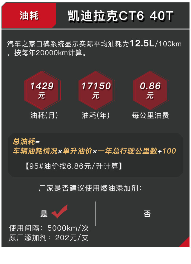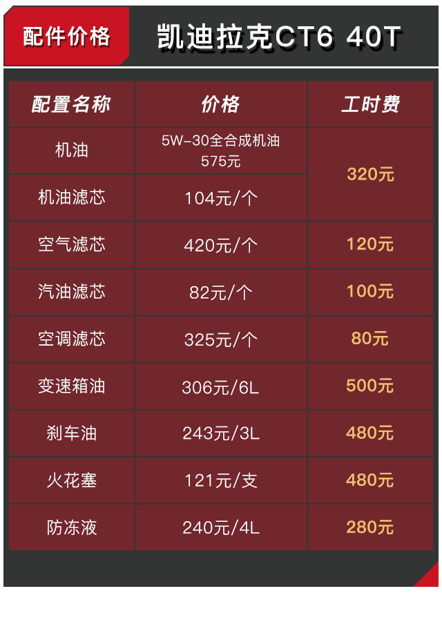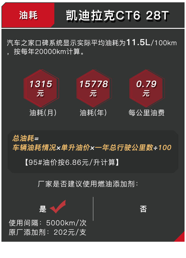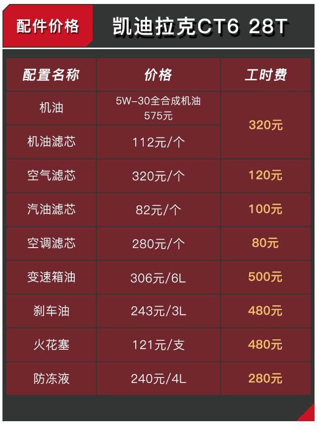 是计算下来,其实28T和40T两个版本在保养方面几乎相差无几,而作为一款豪华型轿车来说,每月的总花销大概在2400-2800左右,还是可以接受的,而通过价格你会发现,其实汽车后期费用真正的大头主要集中在油费上,而每一位消费者每年所行驶的里程数都是不一样的,所以以上的数据也是仅供参考,而对于真实的报价,各位CT6车主也不妨按这样的计算方式来算一算,咱们评论区见!