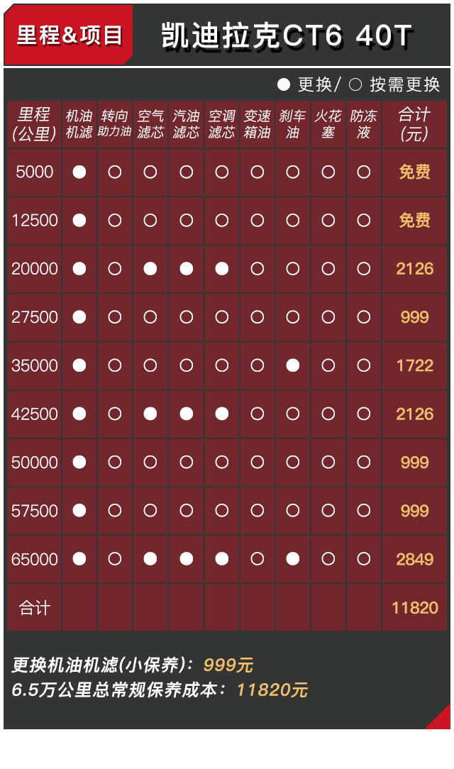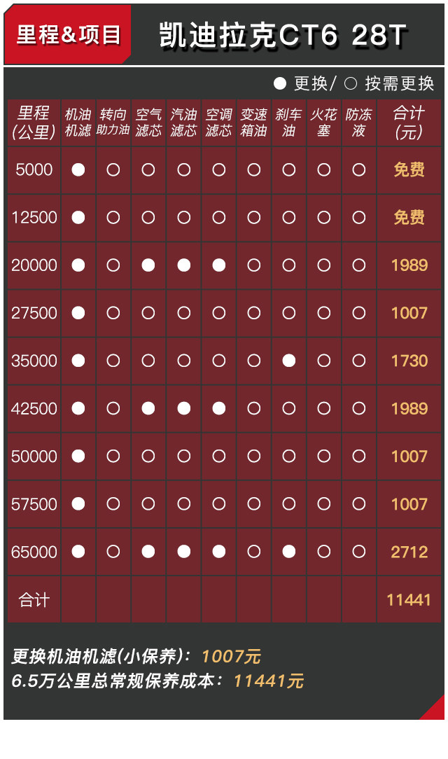 总结下来凯迪拉克CT6的保养周期为7500km/次,这个周期属于中规中矩,而且在易损件的更换周期比较长,也能大大降低了后期的用车费用,值得一说的是CT6的首保和二宝都是免费的。