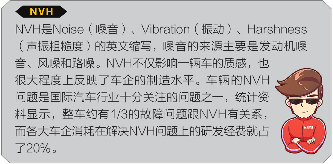 从舒适性角度来看,NVH的性能可以体现一辆车的档次和驾乘质感,车内噪音和振动当然是越低越好,一辆车开起来舒不舒服,NVH的影响占据半壁江山。就算是一个对车不怎么了解的人,在驾乘的过程中,也能从NVH的表现中感受到车的档次,特别是跑高速的时候尤为明显。撩妹毕竟是汽车的一项重要功能,试想下如果车里充斥着烦人的风噪路噪等各种噪音,交谈都费劲,还怎么撩呢?