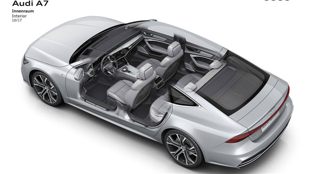 内饰部分,全新A7除了没有采用主动开闭的空调出风口,并保留了传统造型的方向盘以外,其内饰风格基本和全新A8相同。中控台整体面向驾驶员一侧倾斜,以强调运动车型的特点。