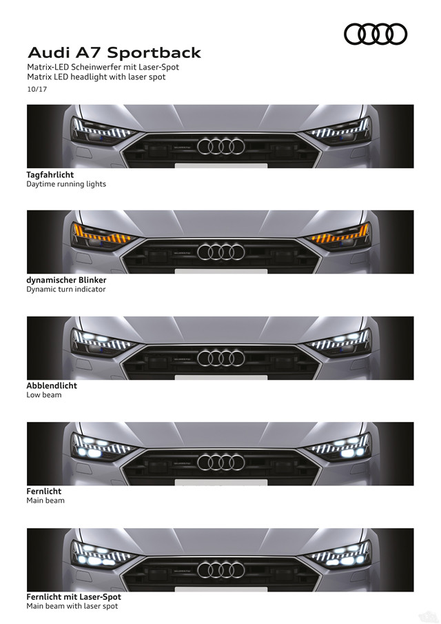 如上图所示,前大灯总共分为LED、高清矩阵LED、带激光远光灯的高清矩阵LED三种型号。日间行车灯由12个间隔开的窄条状LED光带组成,光栅上下分别是LED近远光灯和激光光源的辅助远光灯。