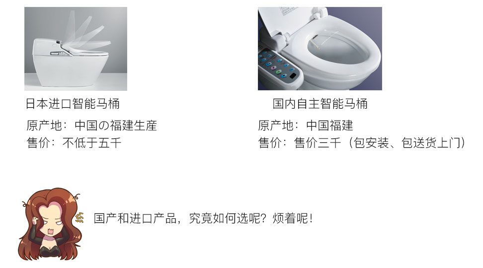 确定完正确的目标方向以后,却发现一道难题摆在了一姐面前。作为我们办公室最会持家的一姐,却想为家里添置一个智能马桶,却不知道选择国产还是选择进口的产品!