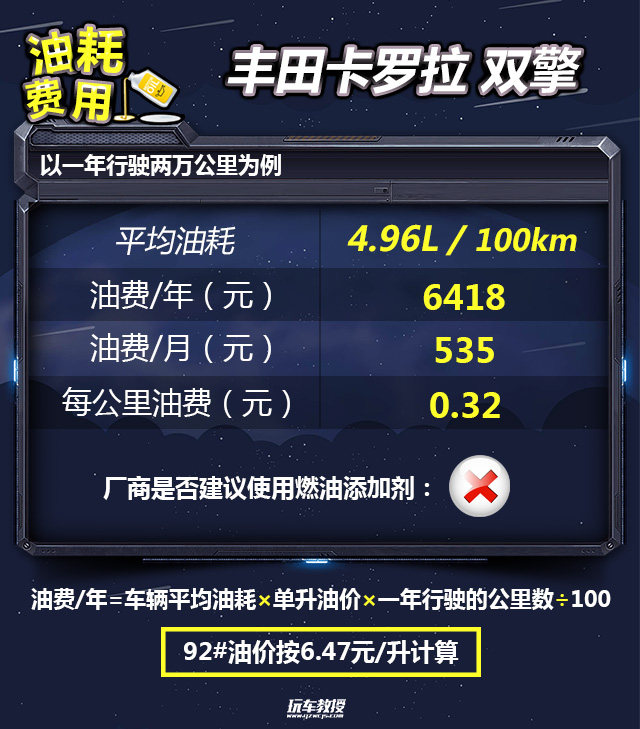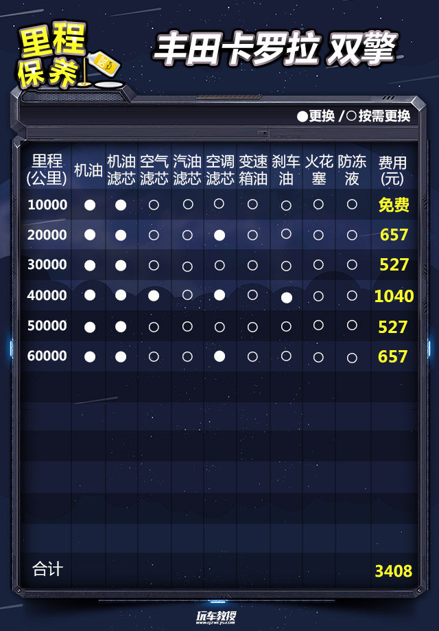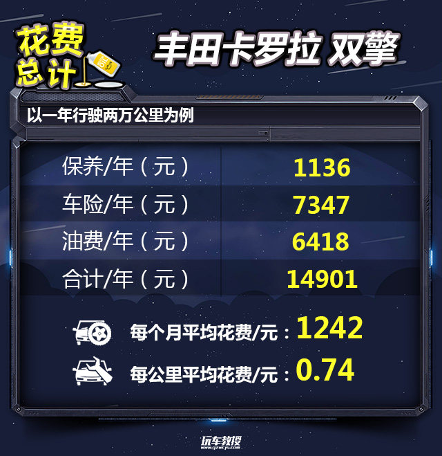 教授总结:从保养分析结果来看,卡罗拉双擎的小保养费用为527元,由于混合动力蓄电池有8年20万公里保障,所以卡罗拉双擎三年6万公里保养费用仅仅需要3408元,以一年两万公里为例,每年平均的保养费用为1136元。加上双擎超省油的特性,低配的卡罗拉双擎一年的养车费用为14901万,折算下来每月仅需1242元,可以说是十分经济实惠的。