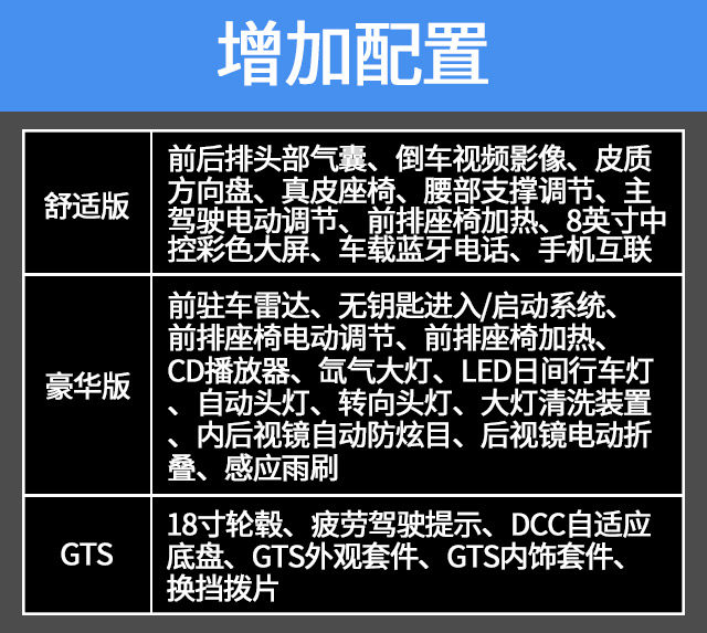 豪华版增加的配置基本都是灯灯灯灯,没啥亮点,也没啥教授觉得非常必要的配置。从性价比来说,教授当然不推荐的啦。当然,如果你是锱铢必较的人,早在前面就关掉这篇文章了。另外,1.8T的没必要买,不如再加1.5万买GTS,动力更加爽快。